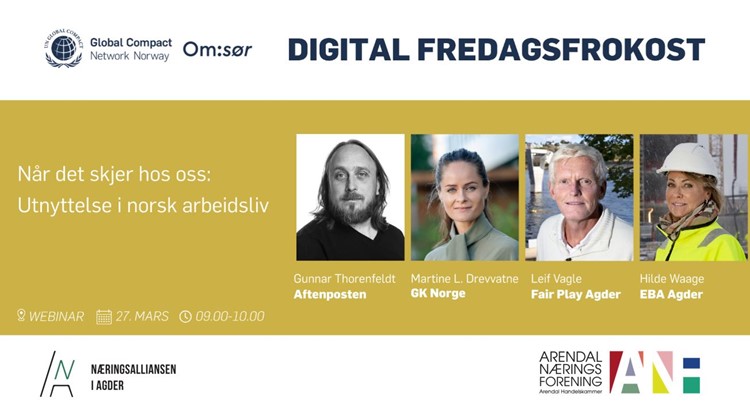 På digital fredagsfrokost i Om:sør 27. mars kl. 09-10 får man innblikk i tematikken arbeidslivskriminalitet og utnyttelse i arbeidsliv. Vi får også med to innledere fra Agder.