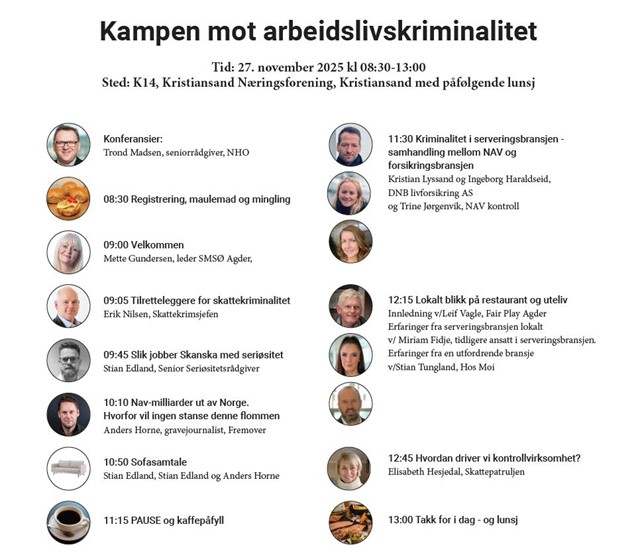 27 nov 2025 Seriøsitetskonferansen 2025 Fair Play Agder Møteinformasjon: Arrangementet avholdes av Arendal Næringsforening Påmelding: Meld deg på her Start: kl 08:30 Slutt: kl 13:00 Sted: K14 - Næringsforeningen i Kristiansandsregionen Adresse: Skippergata 23, Kristiansand Se kart se Last ned invitasjonen ved å trykke på logo nedenfor. Påmelding i link over.